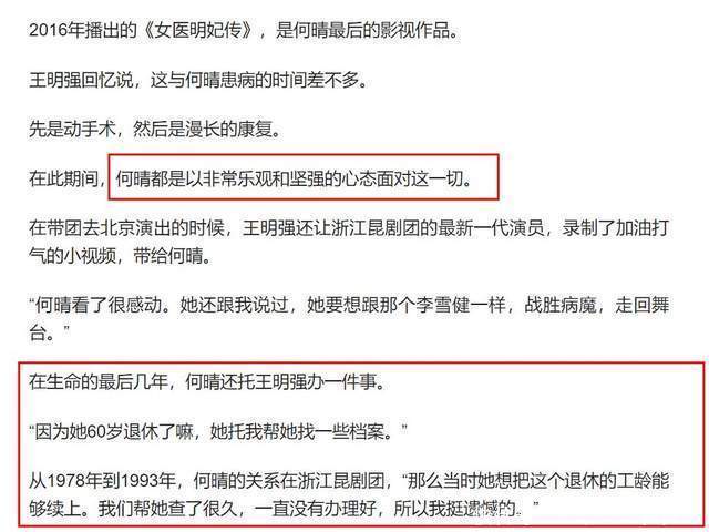 何晴的朋友、浙江昆剧团原团长王明强透露,何晴做完手术之后,他去北京看她,两人抱头痛哭。