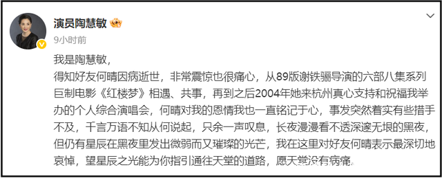 在何晴离世后,演艺界的六小龄童、马德华、金晨、张纪中、黄绮珊、陶慧敏等人纷纷发文悼念。