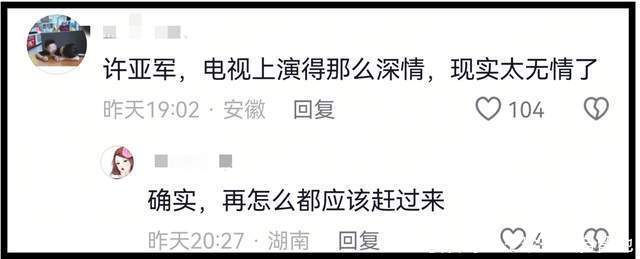 不过也有网友表示能理解许亚军,原因有两点,一是已经离婚了,必须考虑现任妻子的感受。二是在剧组拍戏,不能突然离开,耽误剧组的拍戏进度。